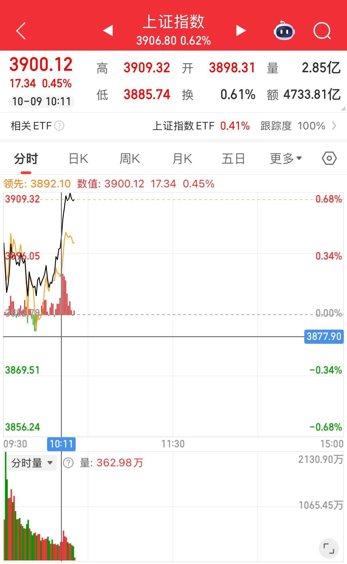10月9日10时11分,沪指强势冲破3900点大关,随后几分钟冲上3910点,再度刷新近10年以来的高点。
