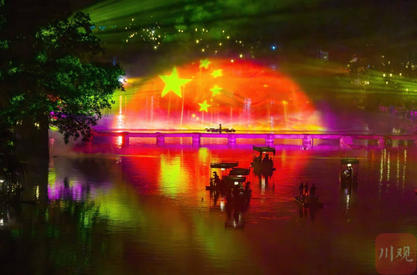 国庆期间,邛崃夹关古镇白沫江上上演五星红旗灯光秀,吸引了众多游客。