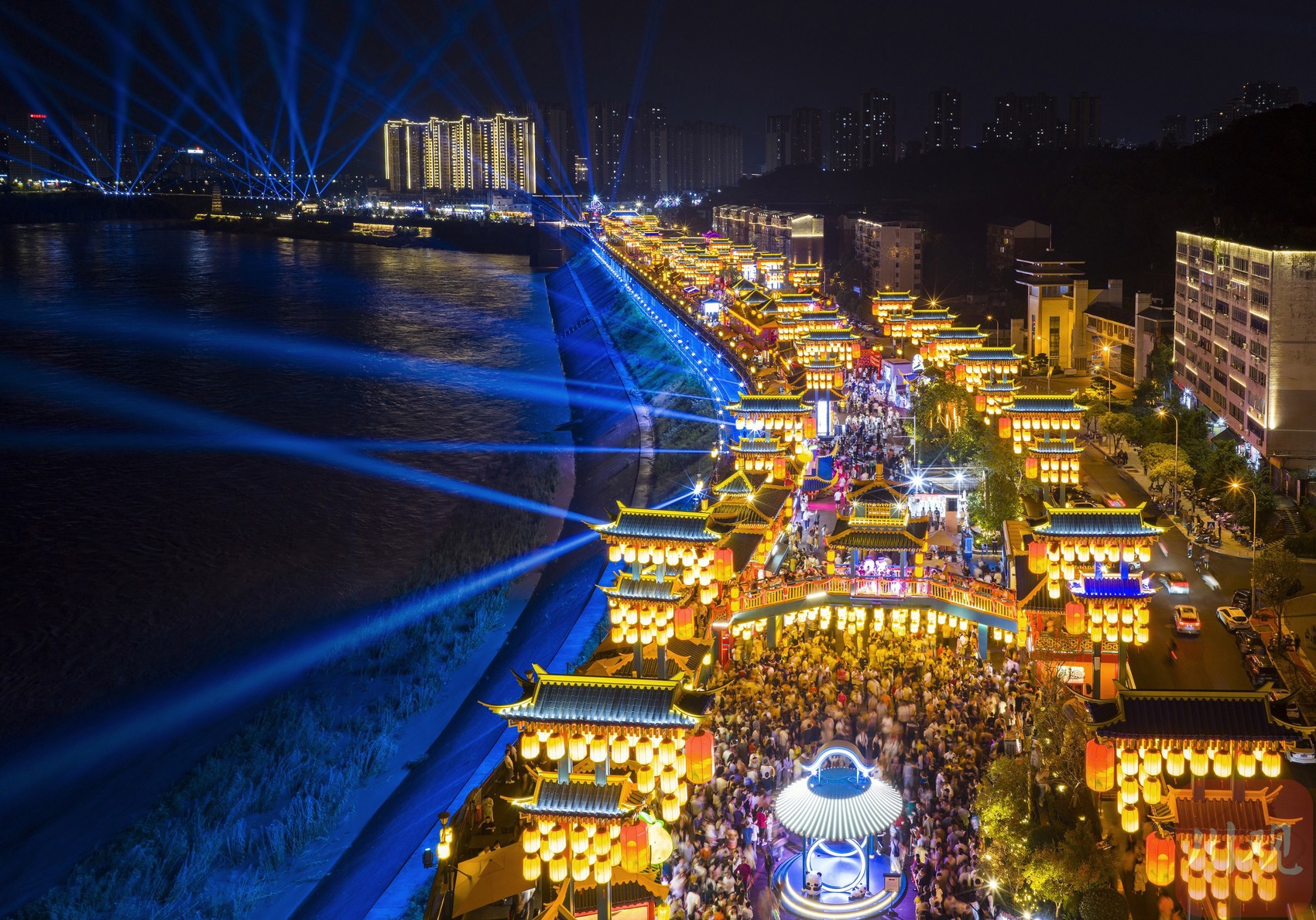 10月1日,广安市广安不夜城灯光璀璨,“宋韵引力场 国庆嘉年华”主题活动吸引了大量游人,现场热闹非凡。