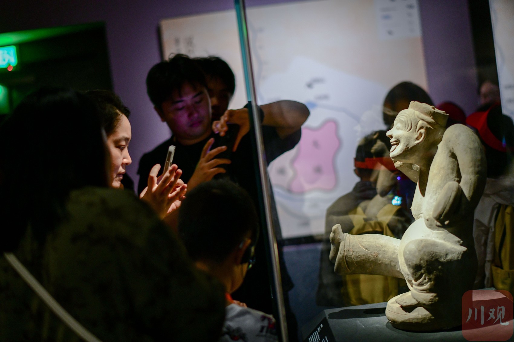 双节期间,成都博物馆设两大特展及三大常设展。10月2日,博物馆内的东汉陶俳优俑前围满了游客。