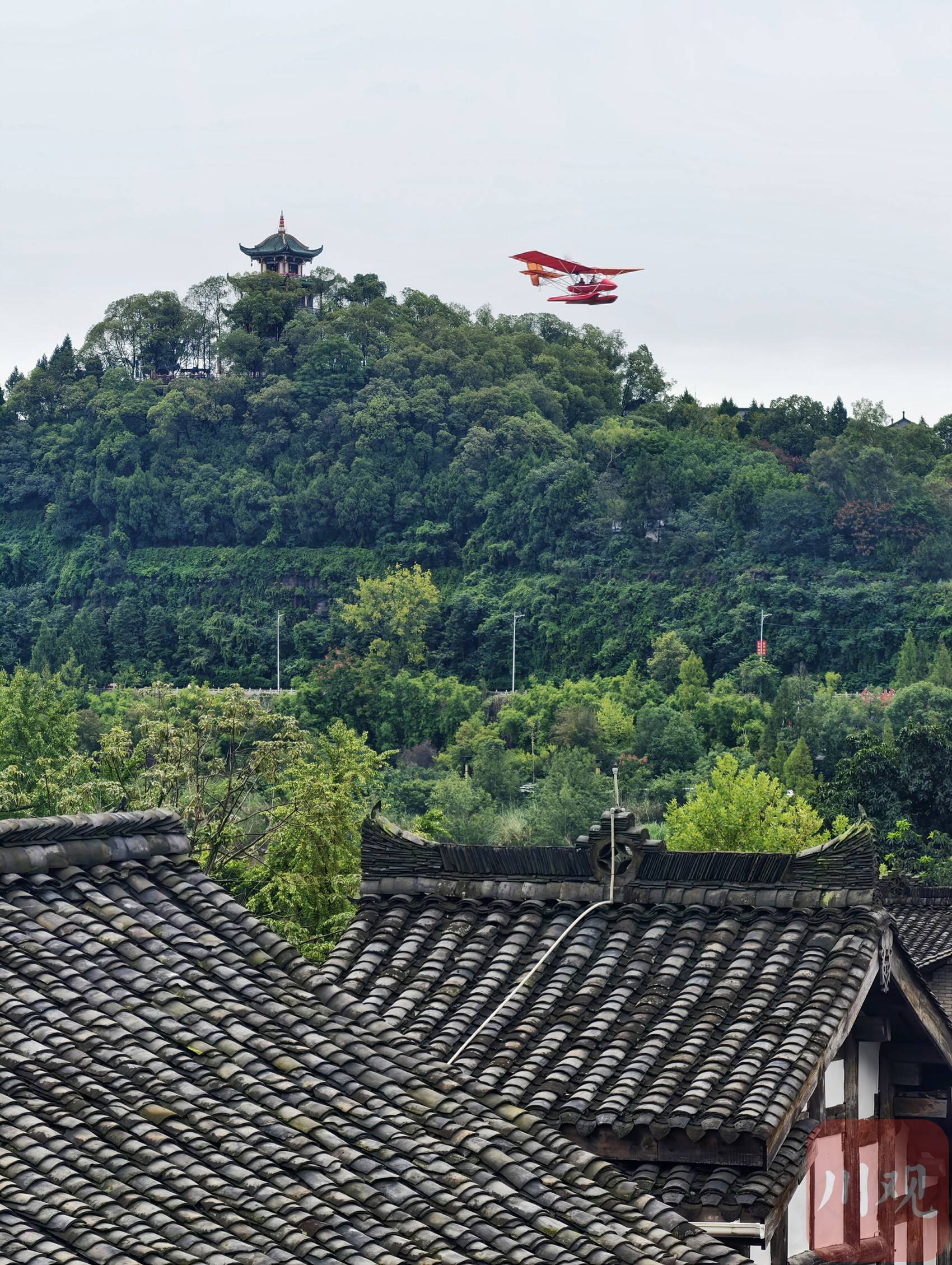 10月2日,游客乘坐低空水上飞机在空中游览阆中古城。
