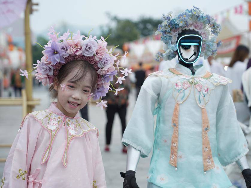 让人眼前一亮的是,古镇今年创新推出“机器人簪花”。头戴簪花的智能机器人在街巷巡游,时而驻足向游客挥手问好,时而停下脚步配合拍照,吸睛无数。近年来,洛带古镇持续打造“洛带簪花”等文旅IP,向华服体验、主题文化场景纵深拓展,让游客感受古镇悠久的历史和独特的客家民俗文化。