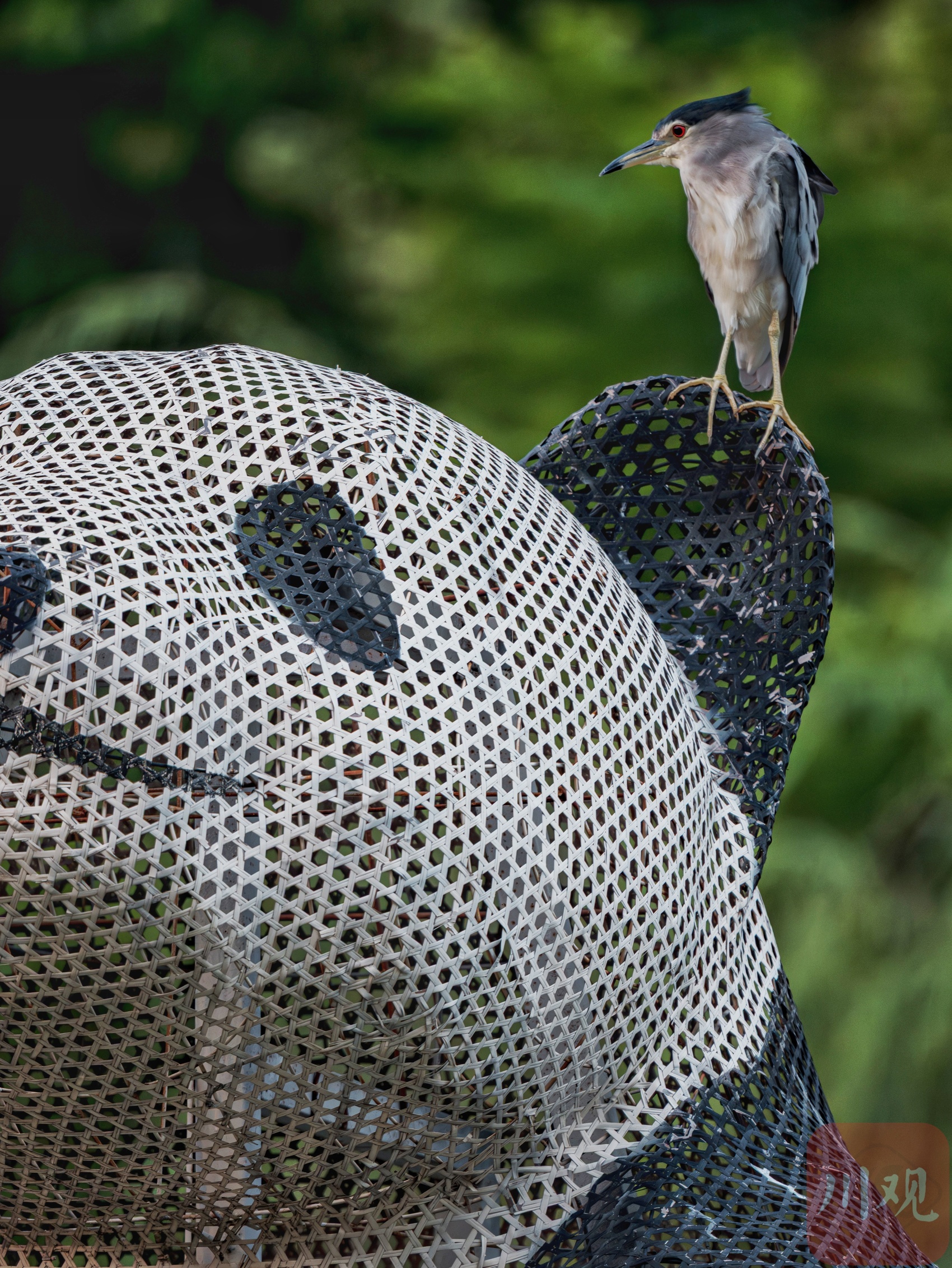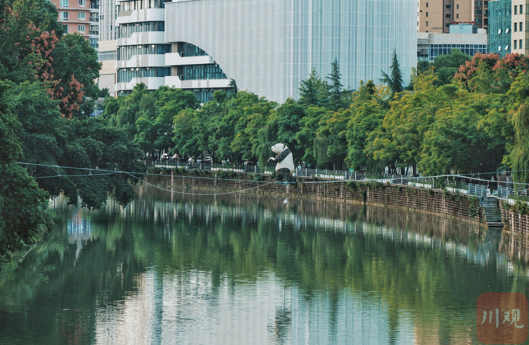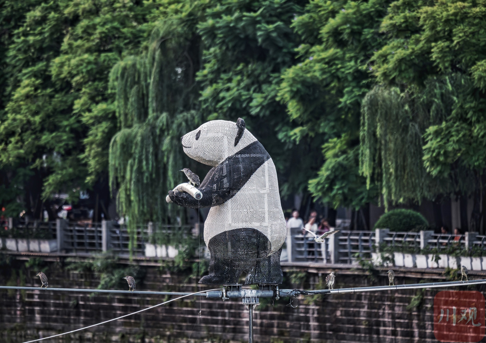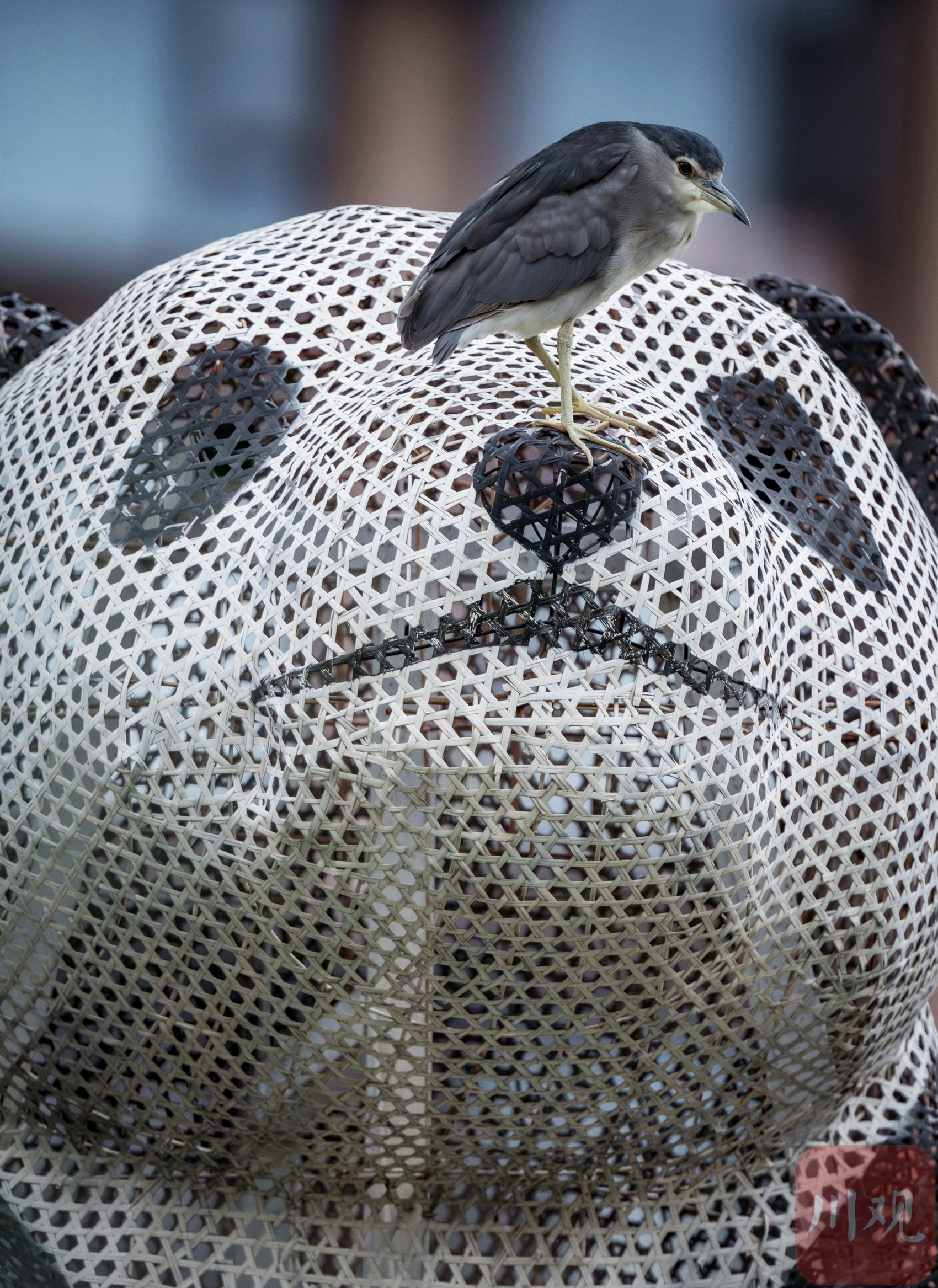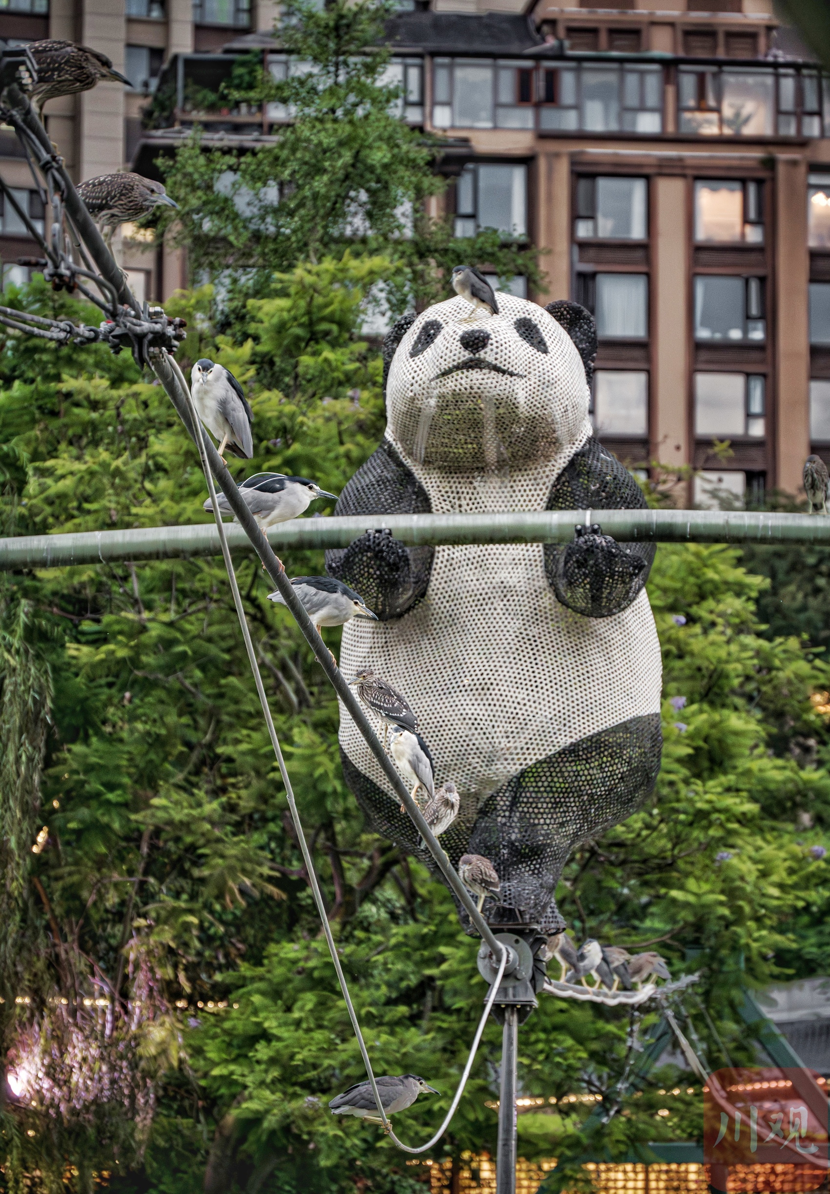 10月8日傍晚,成都市活水公园,在“走钢丝”的竹编大熊猫周围,站满了栖息在此的夜鹭,它们与熊猫一同“发呆”,成为都市里的别致景观。更有调皮的夜鹭在熊猫头顶上来回踱步,与盎然的绿意两岸景色,呈现出一幅惬意的生活画卷。