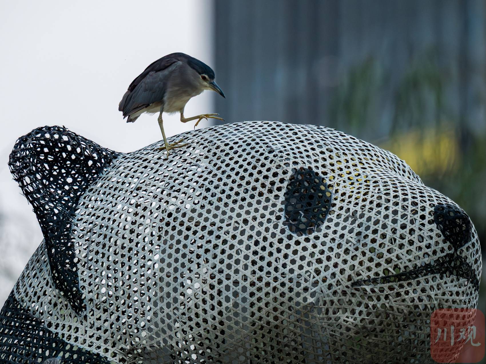 一只夜鹭停在大熊猫雕塑的耳朵上。