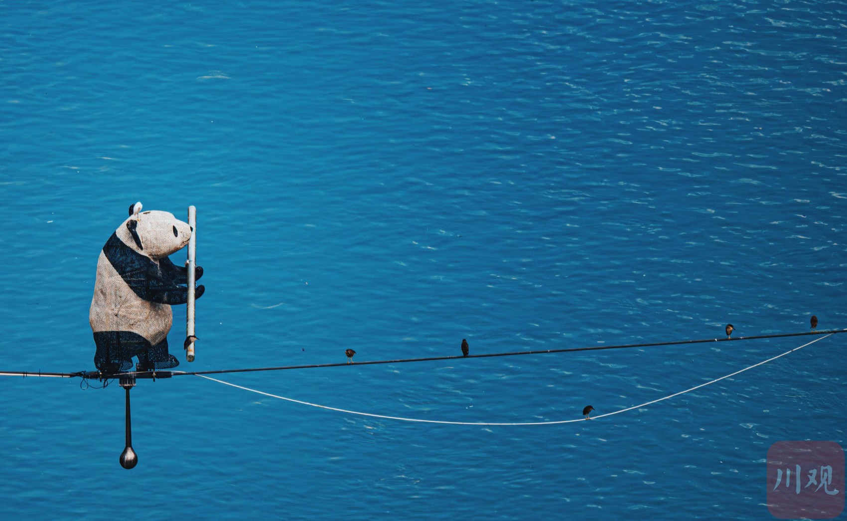 一群夜鹭停在“踩钢丝”的大熊猫装置上。