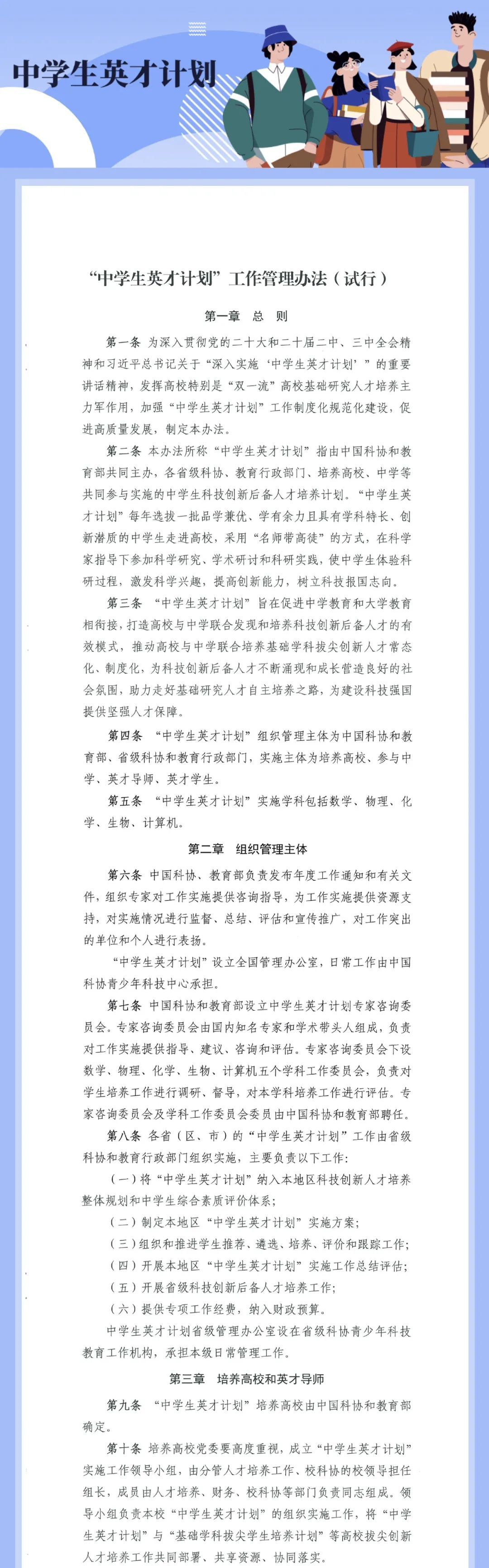中国科协官网显示,“英才计划”全称为中学生科技创新后备人才培养计划,由中国科协和教育部共同主办,各省级科协、教育行政部门、培养高校、中学等共同参与实施。