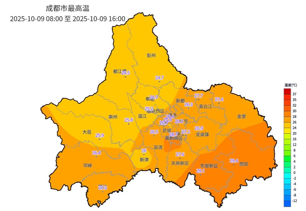 24小时内,盆地最低气温:21~24℃;最高气温:西部26~29℃,其余地方31~34℃。