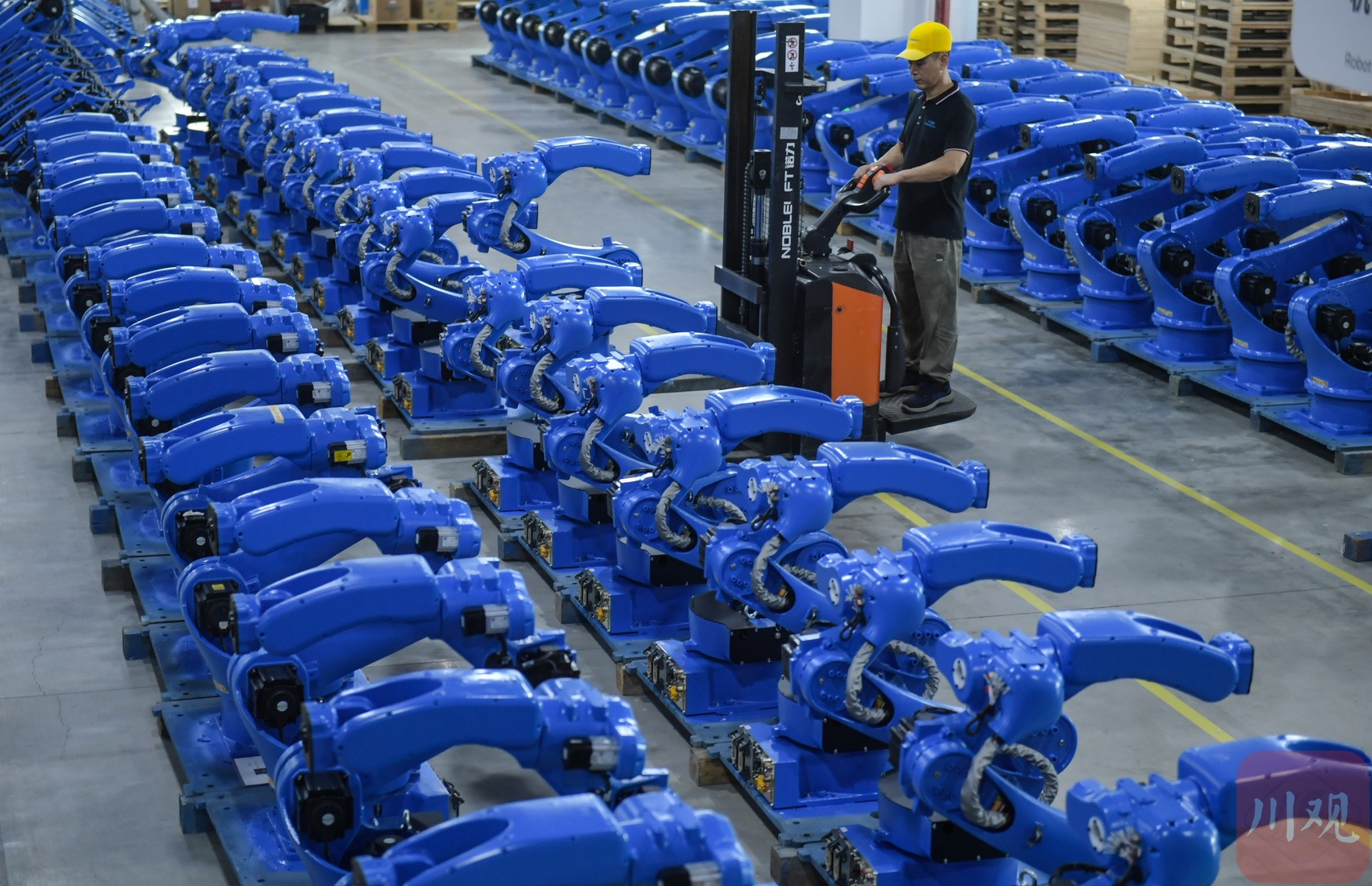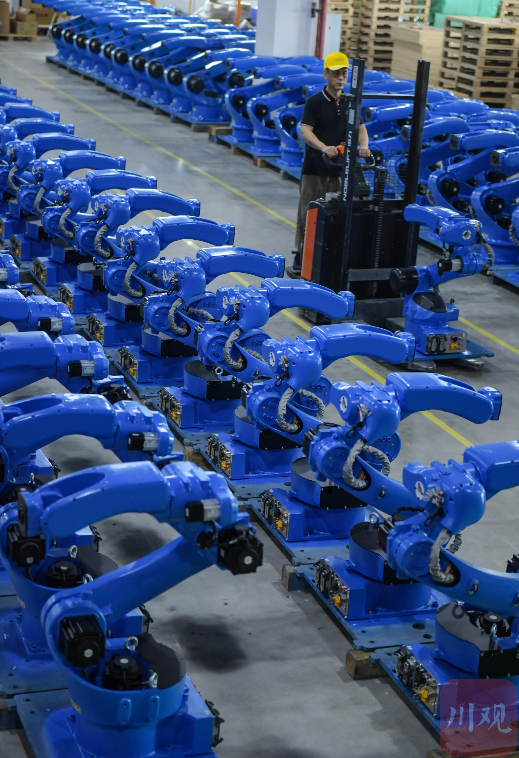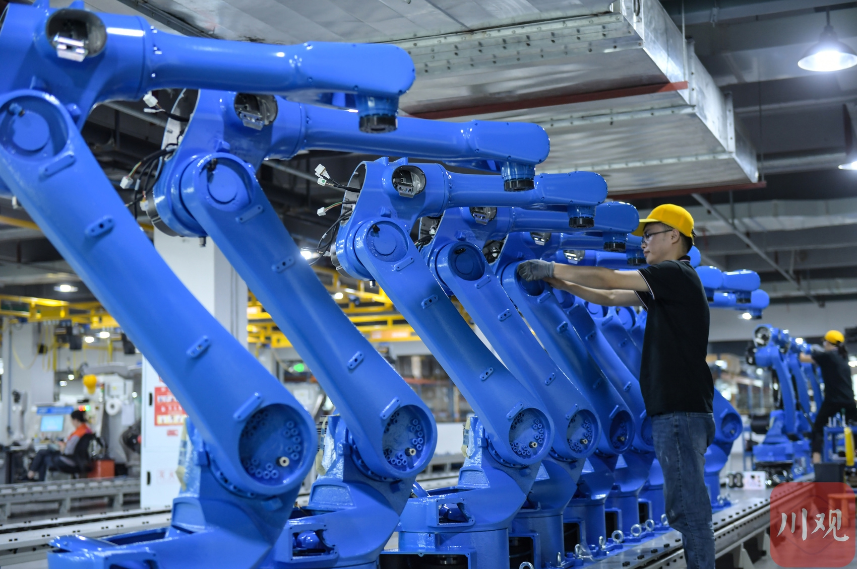 2025年10月10日,位于成都市成华区机器人产业园的成都卡诺普公司生产车间内,一批蓝色工业机器人整齐排列,工人们正进行组装与调试。这些机器人完成后,将发往国内及国际市场。