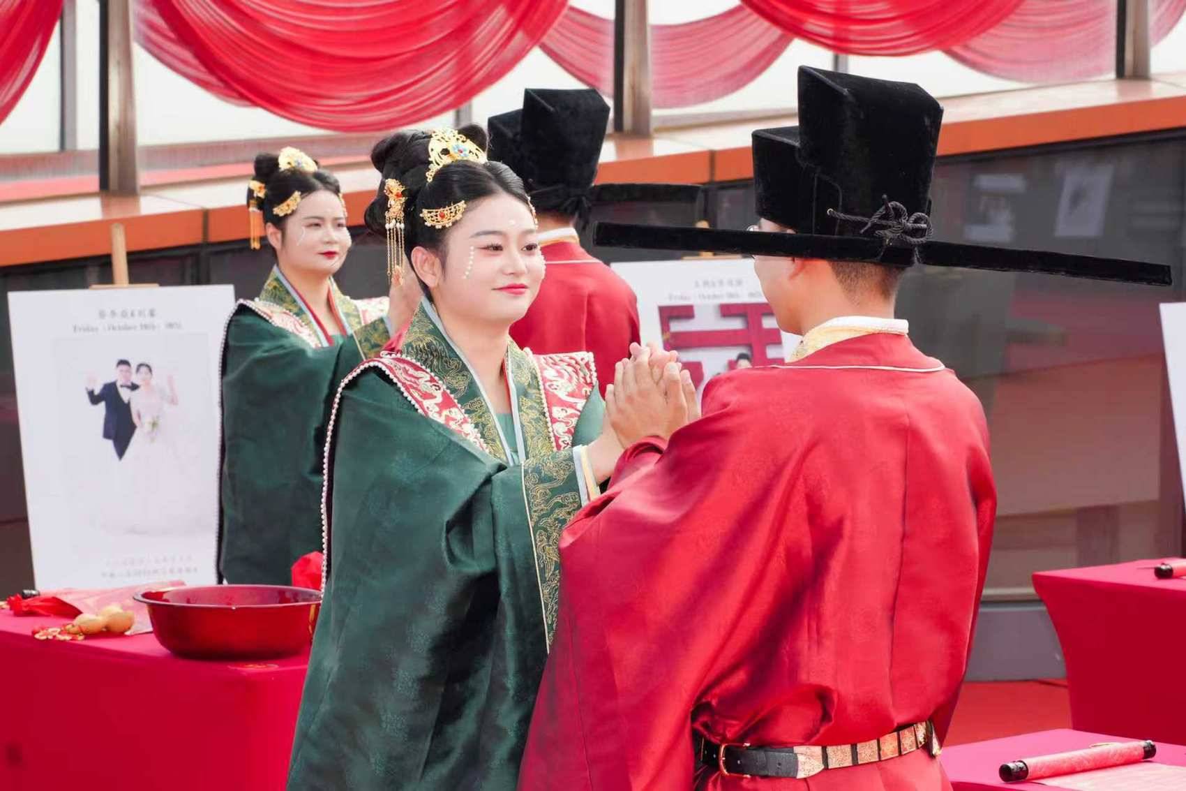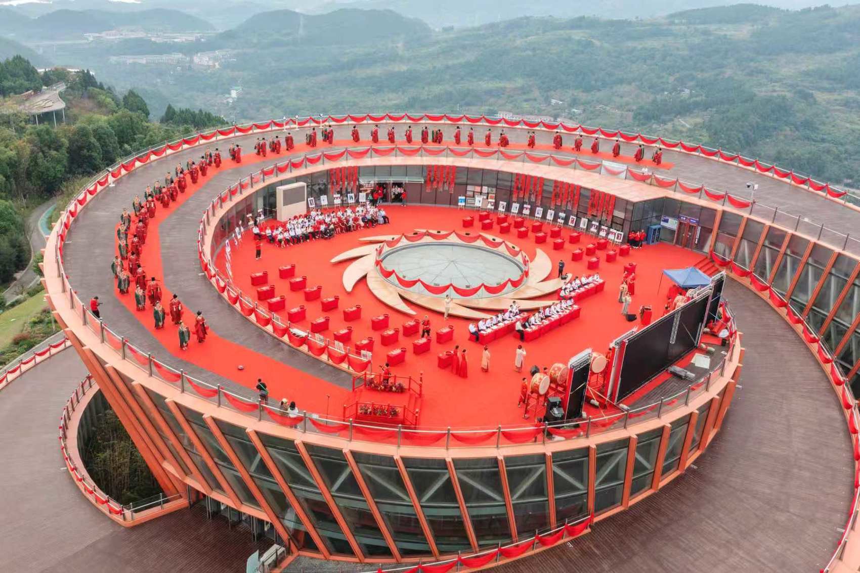10月10日,成都“城市之眼”龙泉山丹景台红锦盈地,鼓乐喧天。38对新人身着宋制婚服,进行了一场主题为“天工谱鸾凤·良缘荟中铁”的集体婚礼。