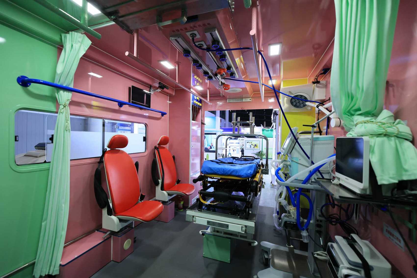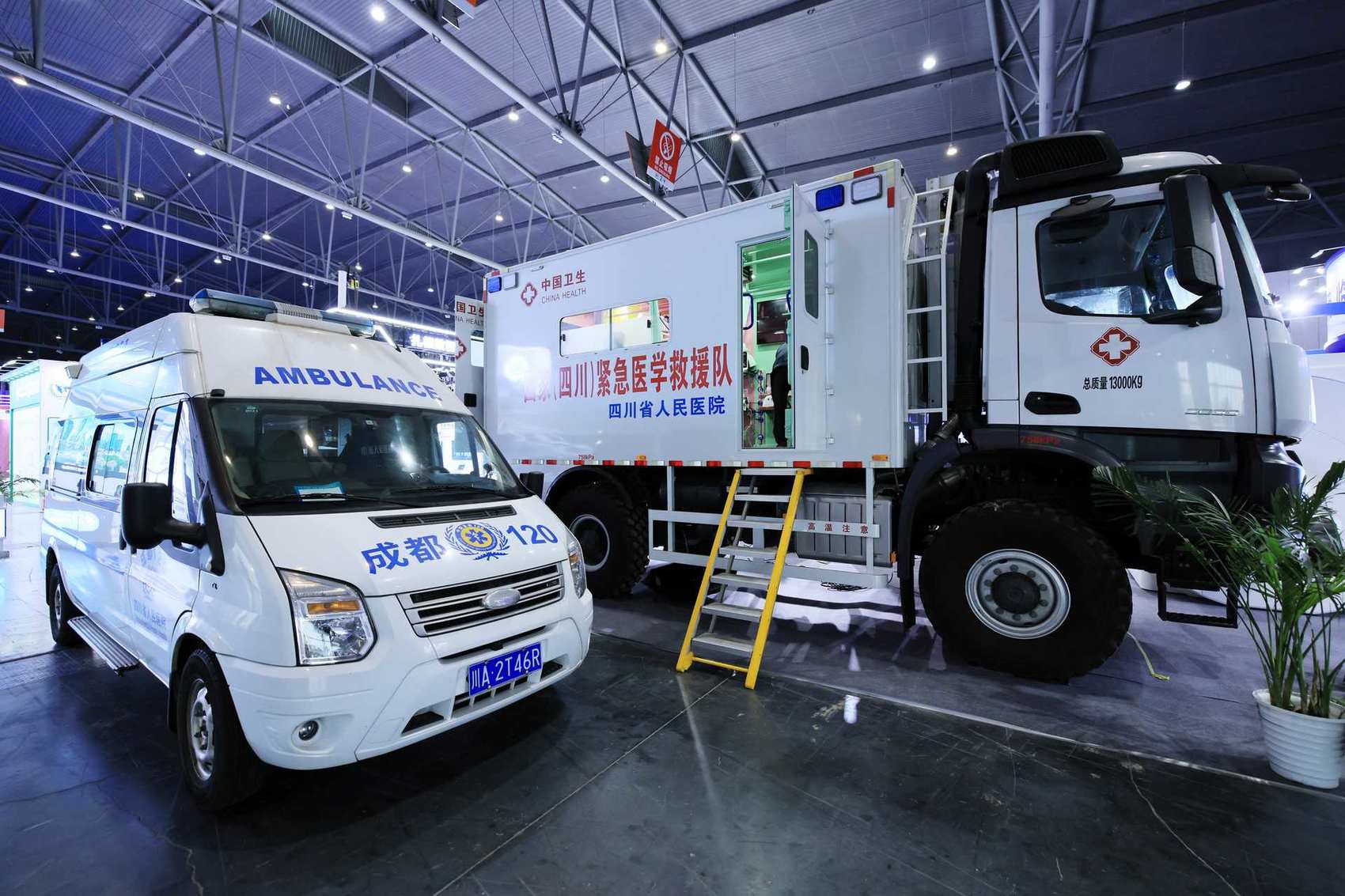 四川省人民医院展区,最吸睛的不是传统的医疗设备,而是两台“能跑能扛”的“大家伙”——全地形越野医疗方舱和5G智慧救护车。