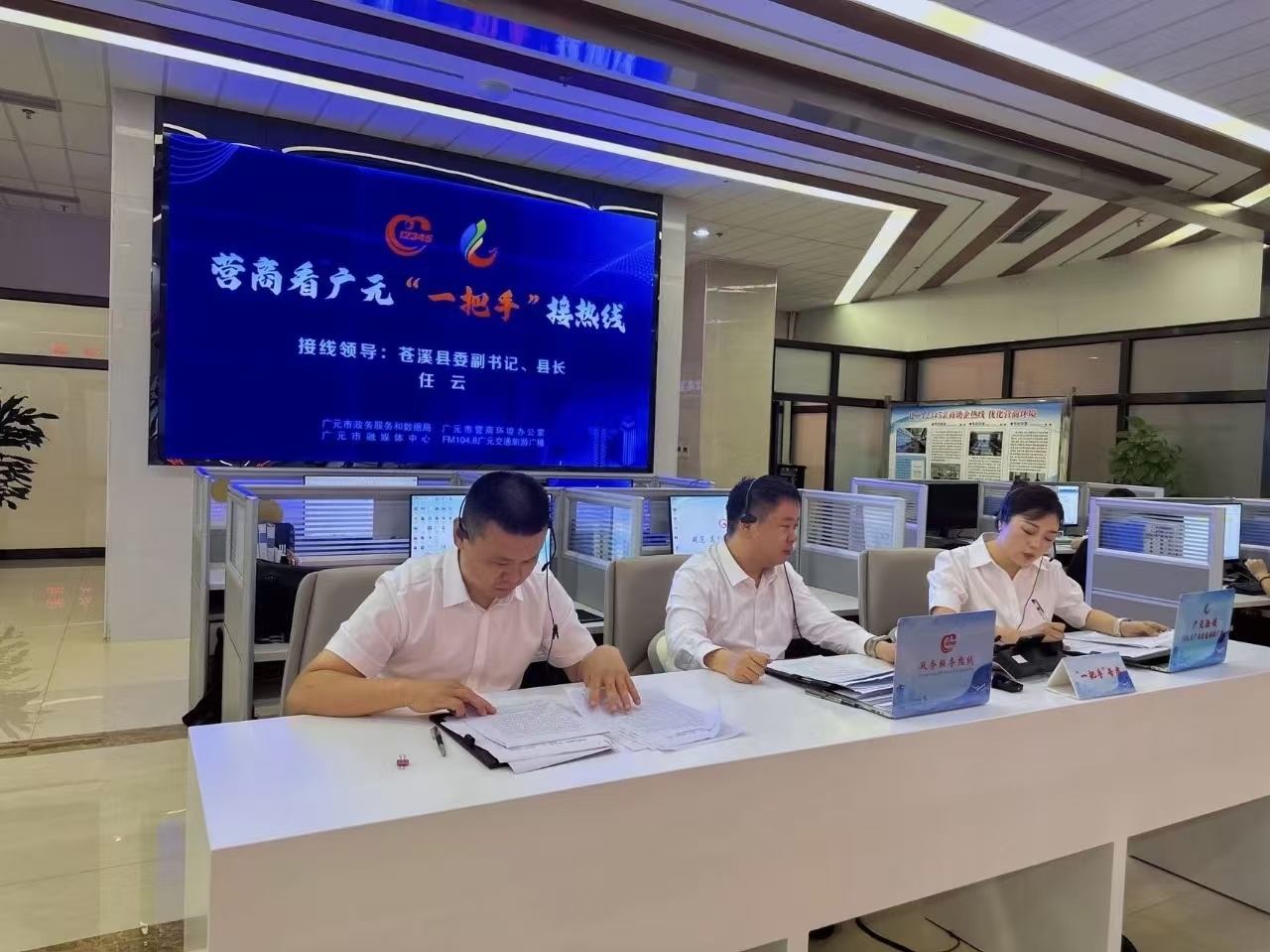 “营商看广元‘一把手’接热线”全媒体直播活动现场。图为苍溪县委副书记、县长任云(中)接听热线。受访者供图