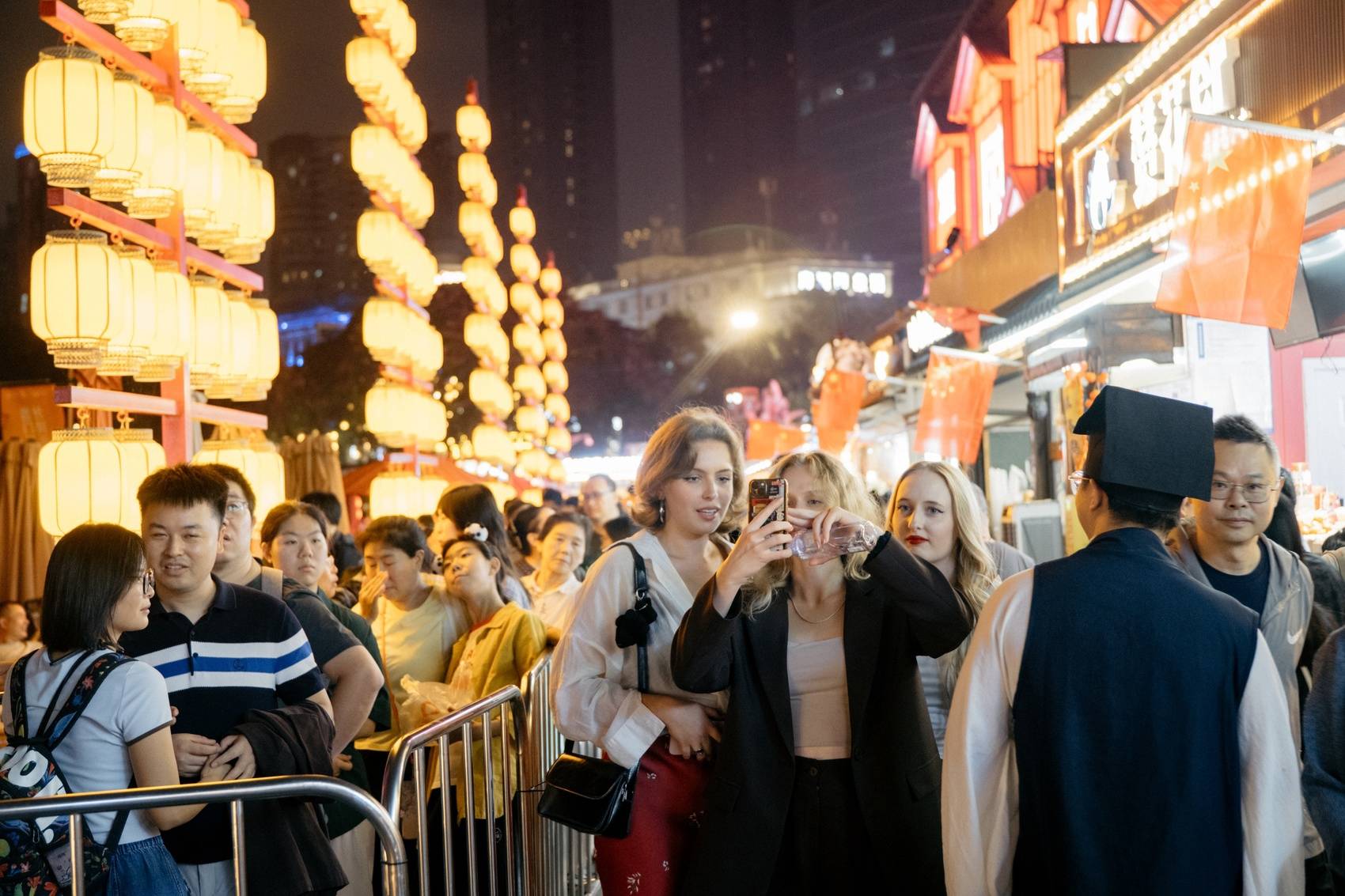 在登船入口处,“李白”正吟诗作对、书写经典诗句,游客只需对答正确,就能领取一份精美书签;不远处,“捣药仙子”正摆桌猜谜,游客通过闻香识物,回答正确不仅能品尝到真正的桂花佳酿,还能获得“夜游锦江”独特的文创产品等。待互动体验项目结束后,街道另一侧则还有各种四川美食、非遗手作、古彩戏法、水岸演绎等多种消费业态。