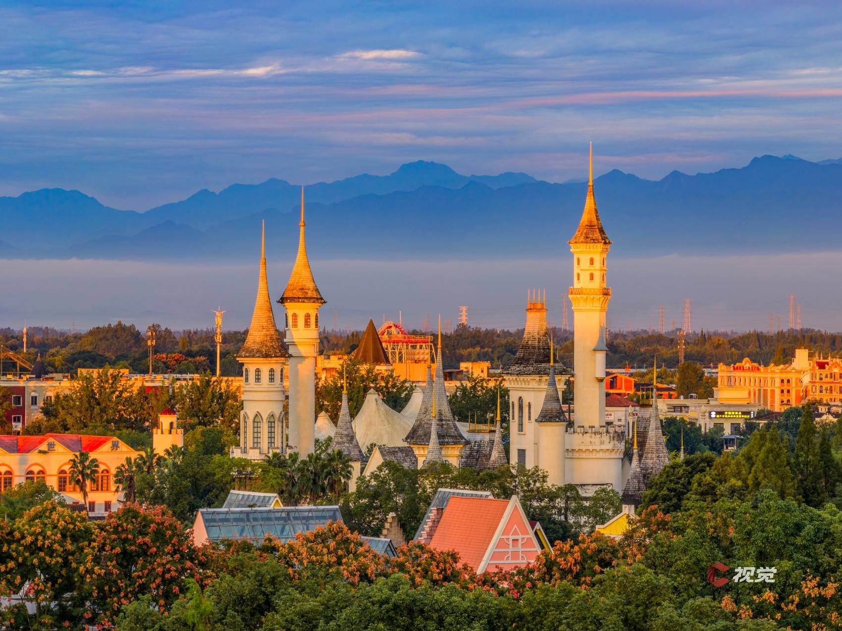 10月13日清晨,天气晴朗,在成都温江国色天乡乐园,阳光洒在童话城堡上,远山为后景,美不胜收。C视觉签约摄影师 张礼彬