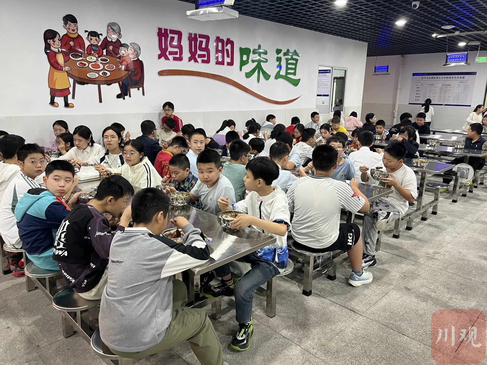10月14日上午10点过,在巴中市巴州区第七小学校的操场,各年级学生正进行大课间体能锻炼,一片欢声笑语。操场角落的师生食堂同样热闹,锅碗瓢盆的碰撞声与饭菜香味交织,不断从食堂飘出。