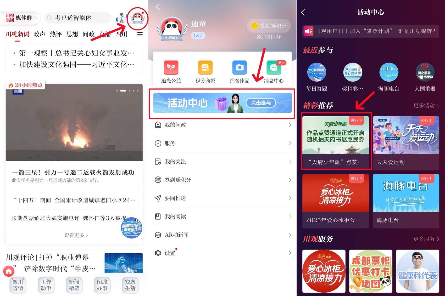 打开川观新闻APP,首页右上角“用户头像”-“活动中心”,进入找到“天府少年派点赞通道”图片,点击即可进入活动。