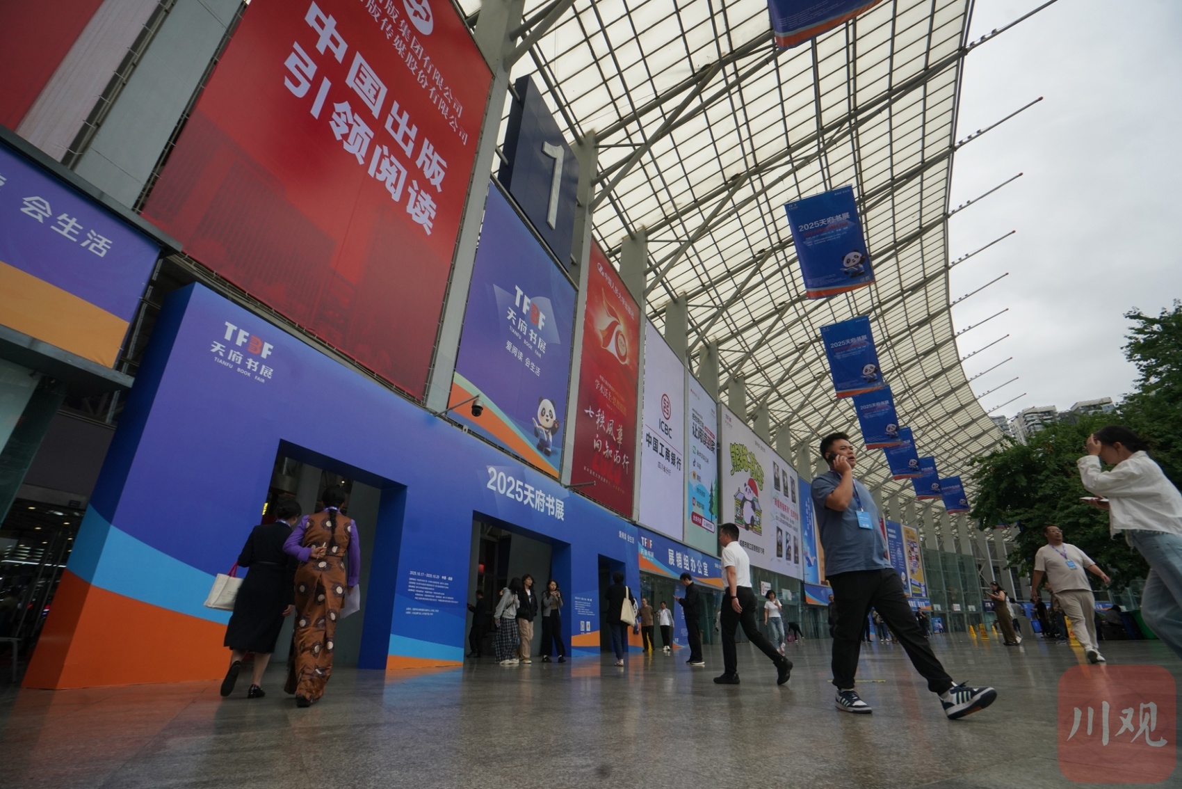 2025天府书展的场馆外观极具特色,玻璃穹顶的建筑结构搭配醒目的红色和蓝色主题海报,不少参会者正走进场馆,展现出书展的盛大与活力。