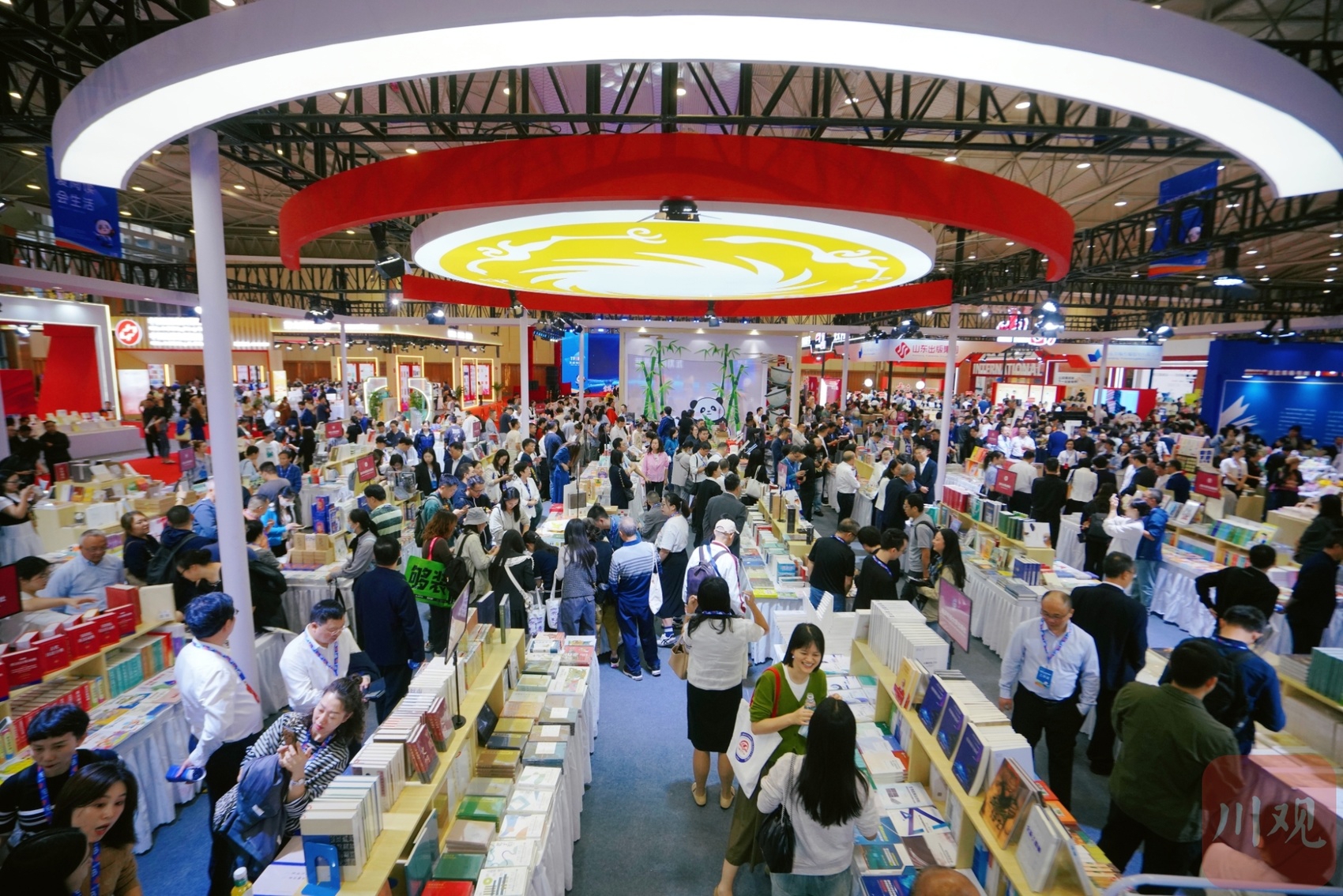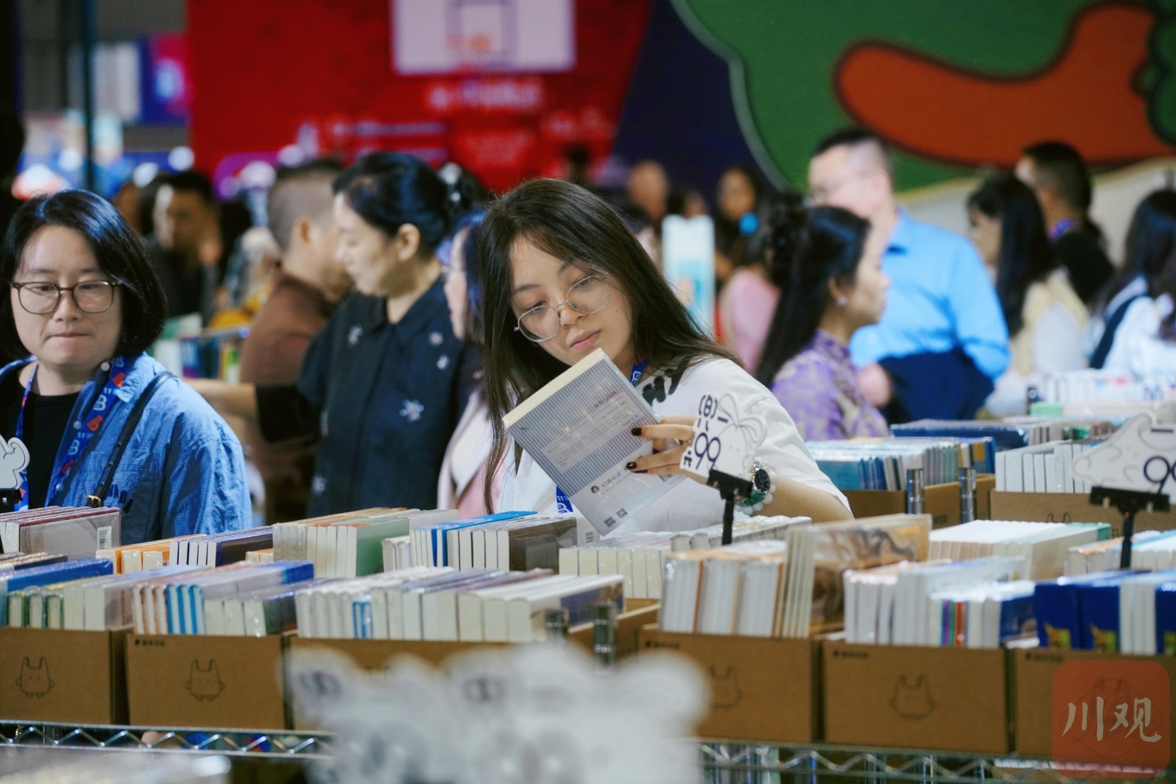 2025天府书展的主展区内人头攒动,众多读者在各个展台间穿梭,挑选书籍。