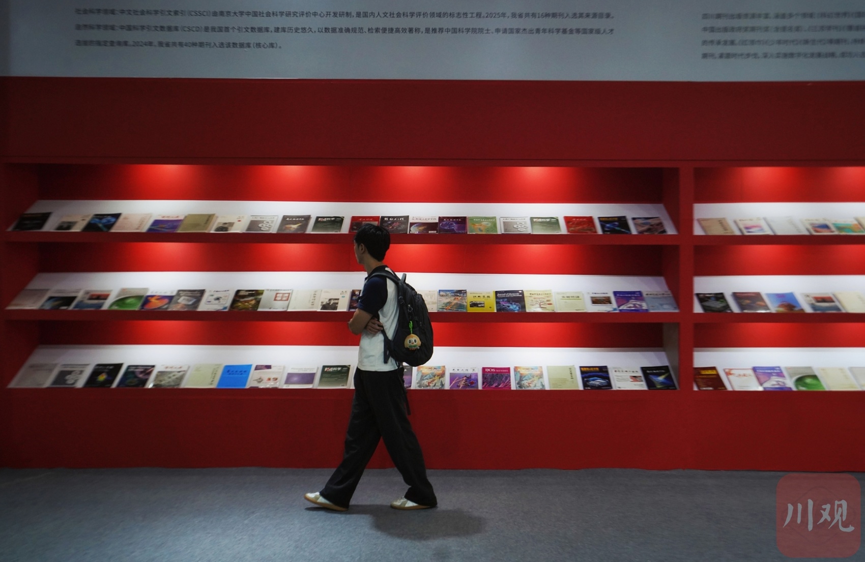 在2025天府书展的展区内,一位背着背包的参观者正走过红色的书架展示区,书架上陈列着各类书籍。