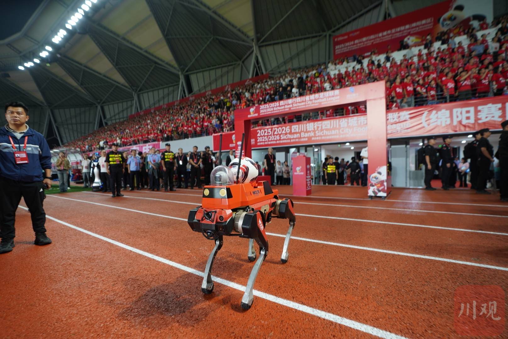 “川超”绵阳主场比赛开球仪式,“绵阳造”机器狼携球入场。郭超英 摄