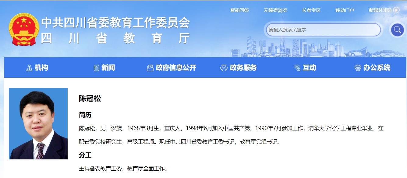 据中共四川省委教育工作委员会、四川省教育厅网站10月20日更新消息,陈冠松已任中共四川省委教育工委书记,教育厅党组书记,主持省委教育工委、教育厅全面工作。