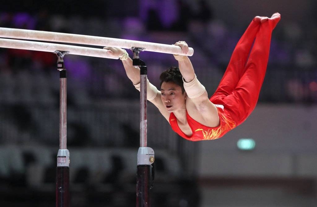 10月20日,中国选手邹敬园在男子资格赛双杠项目比赛中。
