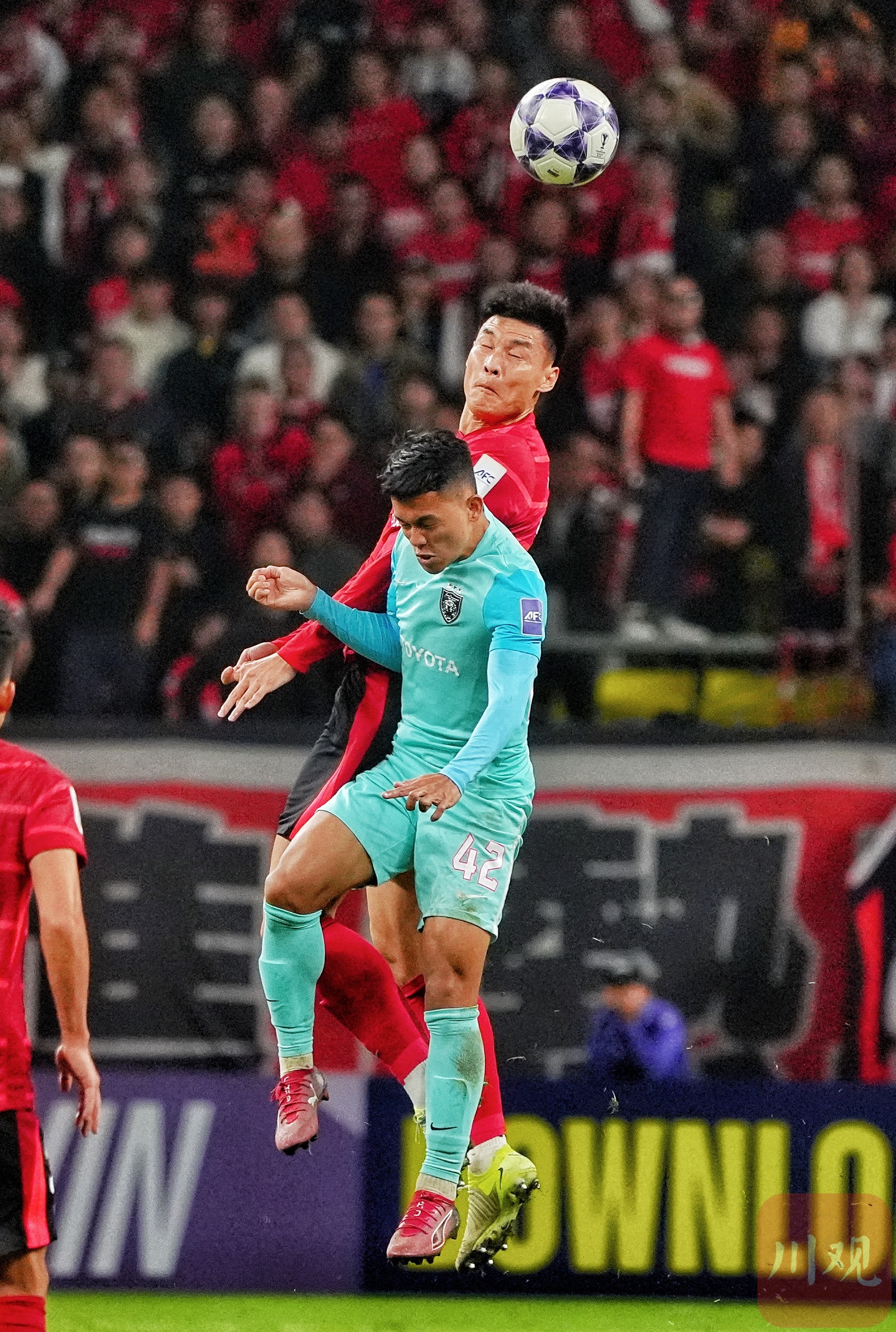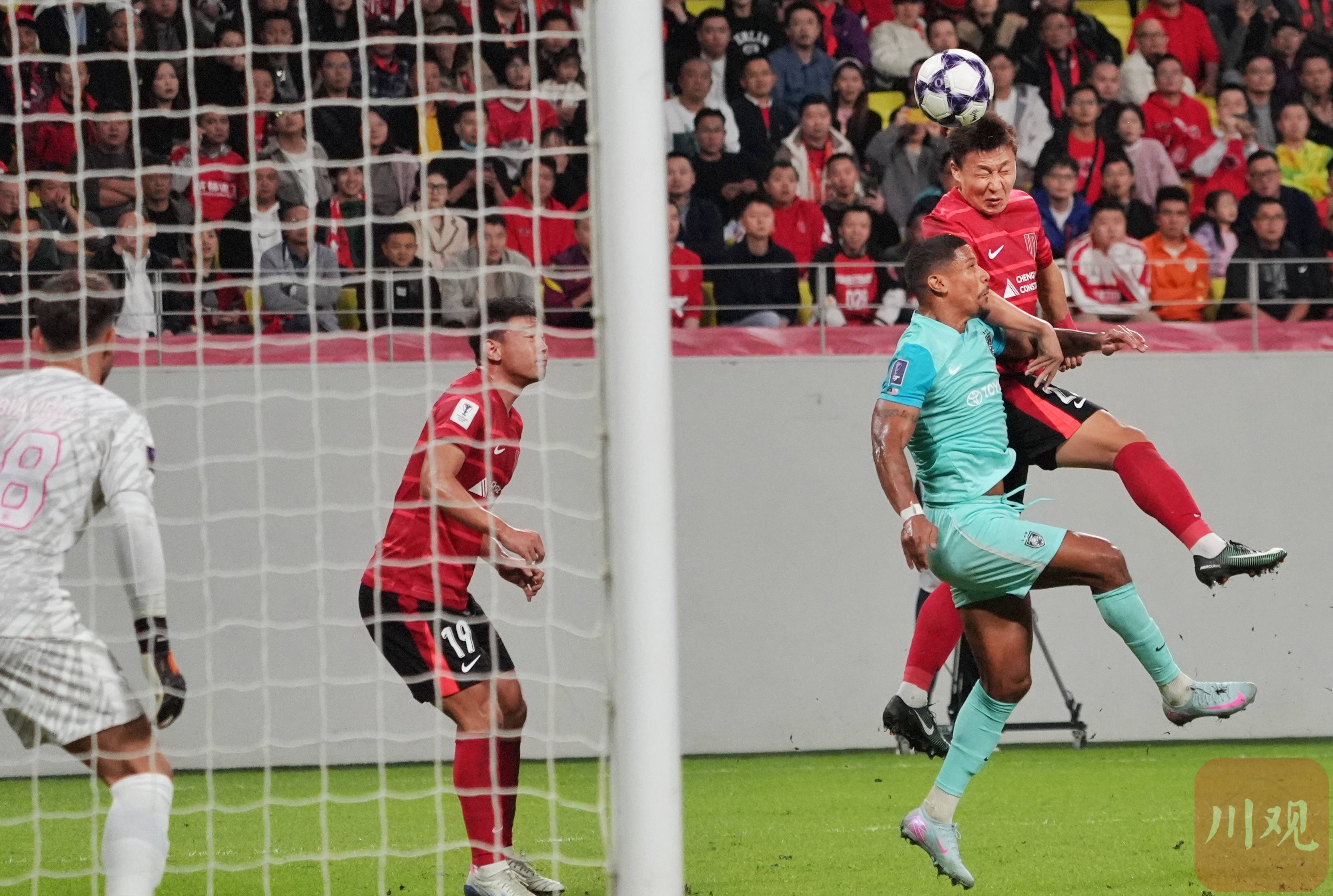 成都蓉城队员头球进攻(红衣成都蓉城队员)。