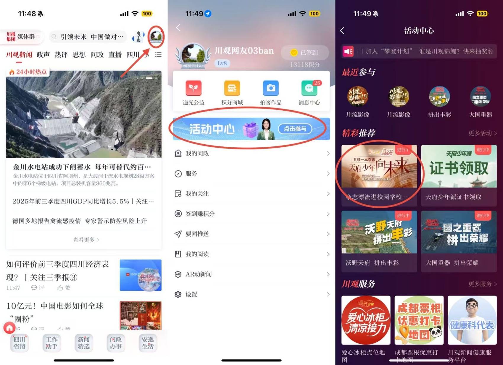方式二:在川观新闻首页,点击右上角“我的”,点击“活动中心”,找到“杂志漂流”推荐通道图片,点击即可参与推荐;
