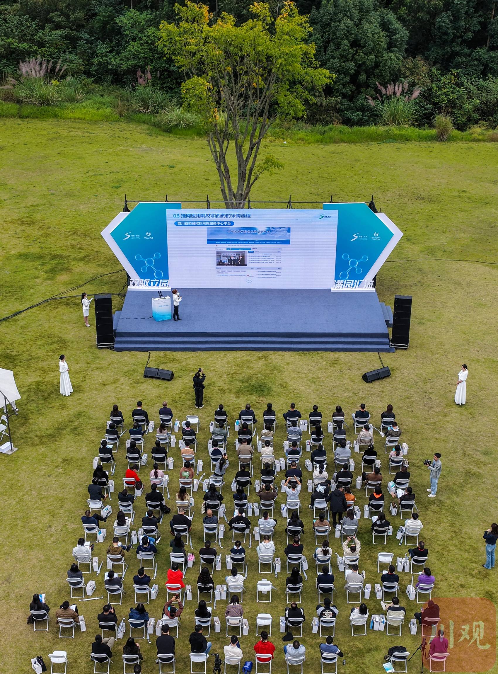 “双驱立园 满园汇流”2025生物医药·展品联谊交流沙龙在成都永安湖城市森林公园未来广场举行,企业代表在台上路演。
