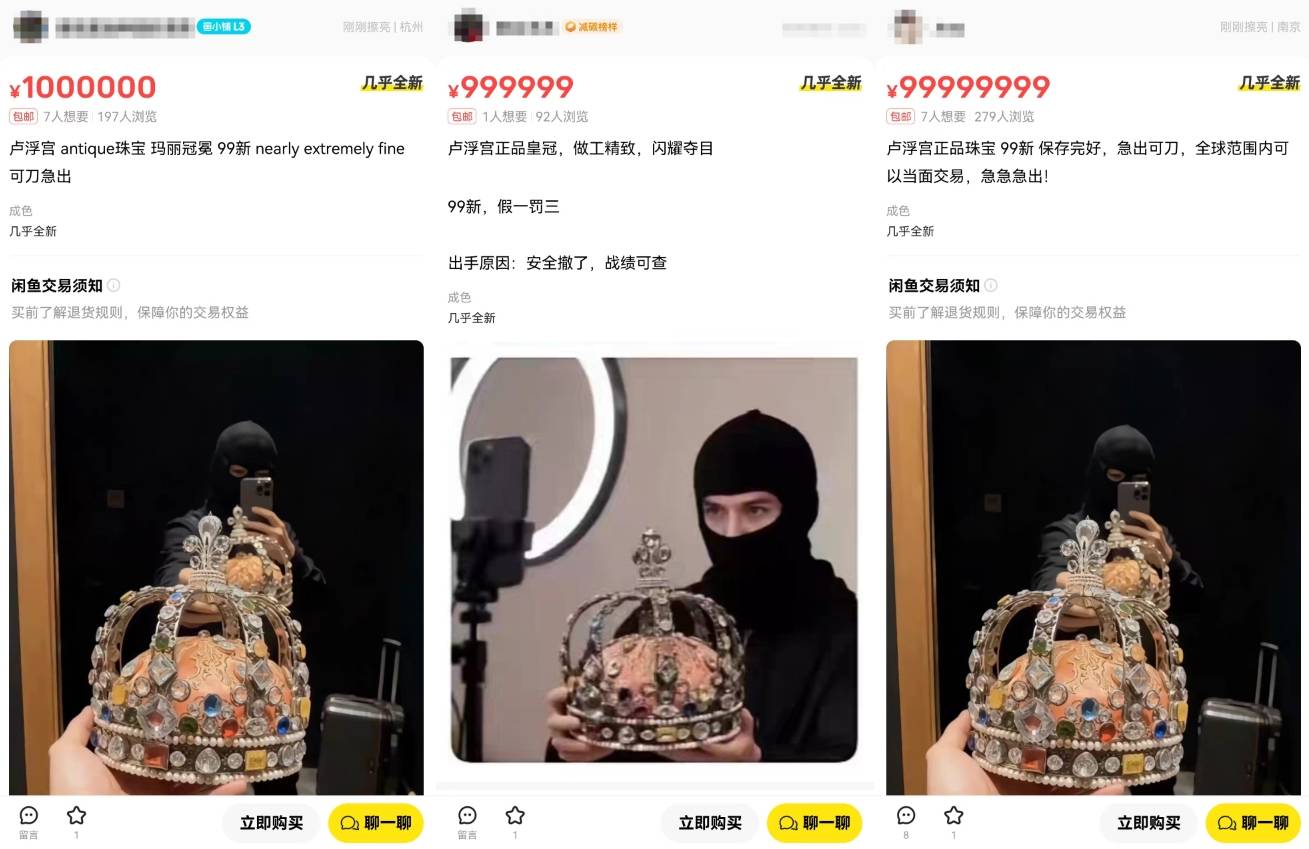 “卢浮宫正品珠宝,急出可刀,全球范围内可以当面交易……”近日,有网友发现,在二手交易平台闲鱼上,多个链接号称出售此前在卢浮宫失窃的珠宝。10月19日,法国巴黎卢浮宫开馆时发生一起持械抢劫事件,报道称数名蒙面嫌犯闯入巴黎卢浮宫,盗走多件藏品。