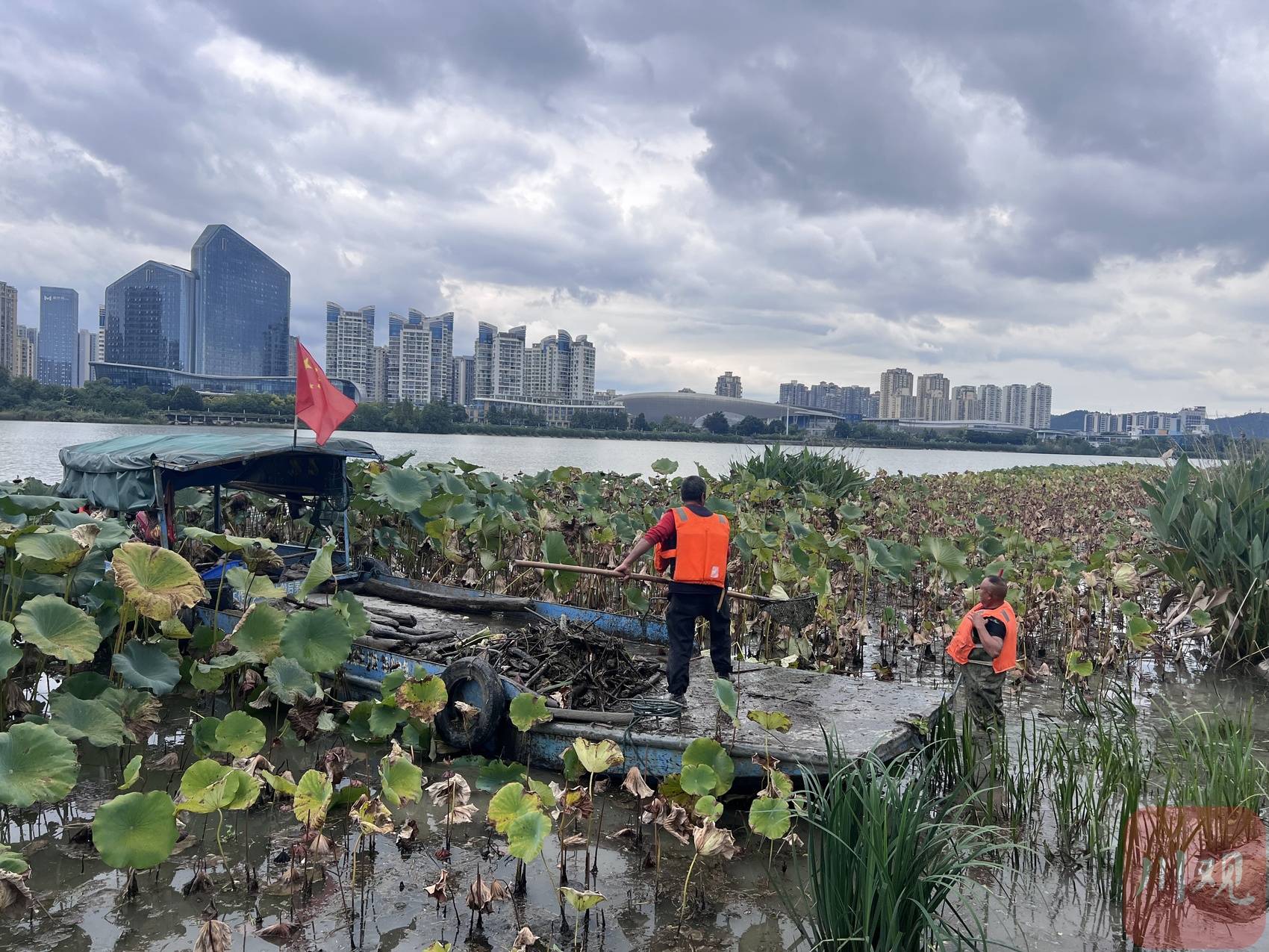 遂宁市船山区圣莲岛,工作人员正在巡河。