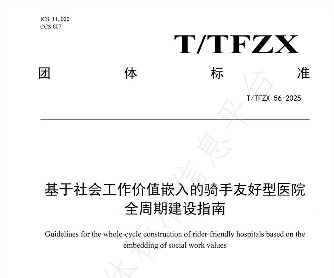 10月24日,记者从成都市新都区获悉,由新都区委社会工作部指导,成都医学院第一附属医院牵头,联合全国20余家医疗机构、高校、行业协会及社会组织,共同起草全国首个《基于社会工作价值嵌入的骑手友好型医院全周期建设指南》团体标准,并于当日正式发布。