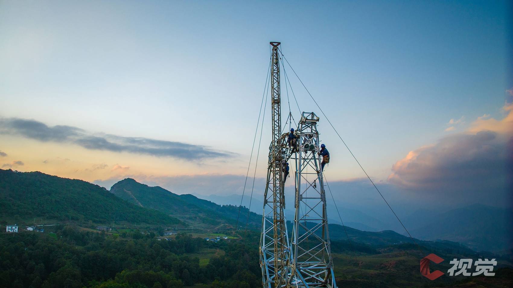 2025年10月23日,夕阳下,国网四川凉山供电公司工作人员正在凉山彝族自治州普格县特兹乡建昌换流站(500千伏变电站)220千伏配套工程施工现场进行组塔作业。
