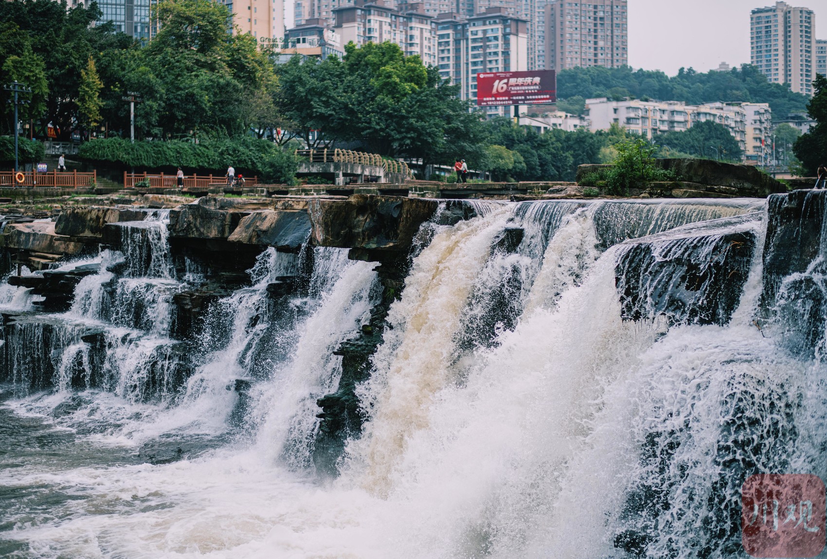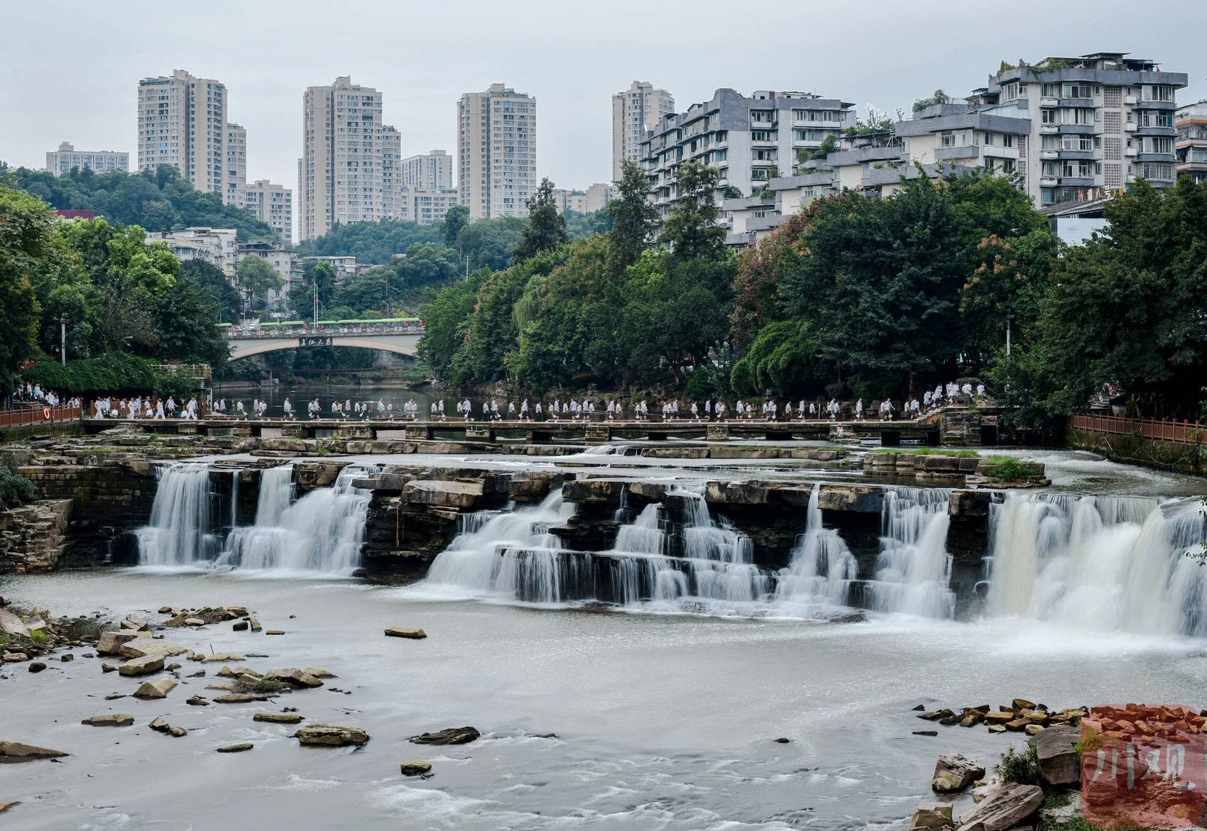 在自贡市贡井区的繁华中心,有一座横跨釜溪河的百年平桥。10月23日,桥上人来人往,桥下几十米处,河水却骤然跌入断崖,形成一道宽约80米的瀑布——这便是当地人习以为常的“通勤天花板”。