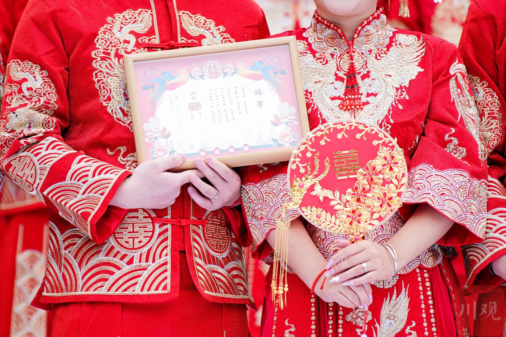 活动由川渝两地民政部门共同打造,仪式现场未见豪华婚车车队与铺张宴席,取而代之的是创意颁证环节——印有芙蓉纹样的成都芙蓉婚书,将传统文化韵味与婚姻承诺巧妙结合,成为新人手中最珍贵的信物。主办方还精心准备了定制秀禾服、纪念对戒等“新人大礼包”,以简约而庄重的安排取代了铺张浪费,生动诠释了“简约不减爱意”的婚俗新理念。