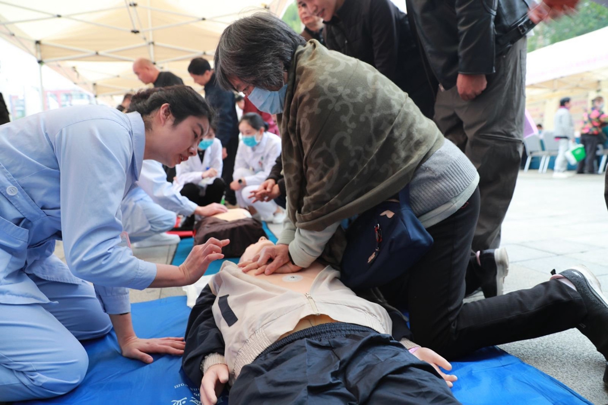 老年医学中心组织的“呼吸操”教学展示,因动作舒缓、简单易学且能有效改善肺功能,吸引了大量现场群众跟练。活动还特别设置了急救培训区,现场讲解并示范自动体外除颤器使用要领,演示了徒手心肺复苏全过程,这一环节吸引了老年朋友认真观摩,成都地铁17号线的员工们也积极参与实操演练,以专业急救技能护航乘客出行安全。