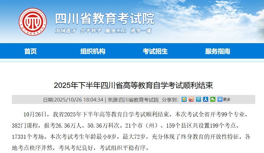 10月26日,四川省教育考试院官方网站发布消息:2025年下半年四川省高等教育自学考试(以下简称:自考)顺利结束。该消息称,本次考试考生年龄最小9岁,最大72岁,充分体现了终身教育的开放性特征。
