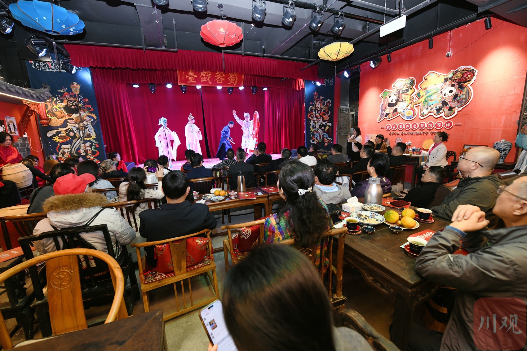 台下观众围坐一起,沉浸式欣赏这场兼具传统与烟火气的川剧表演。