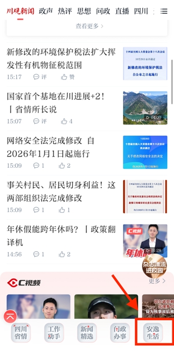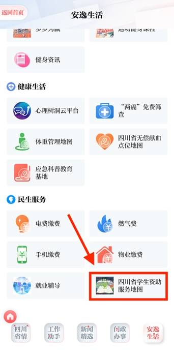 第二步:在川观新闻首页,点击右下方“安逸生活”,进入“安逸生活”板块找到“四川省学生资助服务地图”图片,点击即可使用。