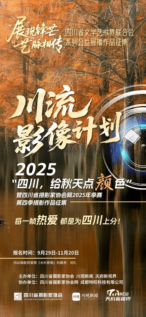 川流影像计划是由四川省文学艺术界联合会、四川日报社作为指导单位,四川省摄影家协会、川观新闻、天府新视界联合主办的系列公益活动。计划拟于每季度推出一次,面向所有热爱摄影的你,每次涵盖公益培训、公益展播、公益教育等精彩内容。
