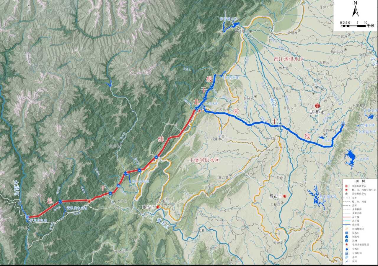 据悉,引大济岷工程输水线路总长为260.9千米,由总干线、南干线和北干线组成;总干线长133.3千米,渠首设计流量80立方米/秒,自西向东输水至成都市三坝水库库尾后分南、北干线;南干线长102.5千米,渠首设计流量48立方米/秒;北干线长25.1公里,渠首设计流量37立方米/秒。沿程利用水位落差设置3座动能回收电站,总装机容量38.8万千瓦;工程总工期96个月,估算总投资为5751883万元。