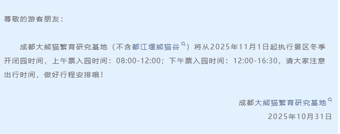 10月31日,成都大熊猫繁育研究基地发布关于执行景区冬季开闭园时间的温馨提示: