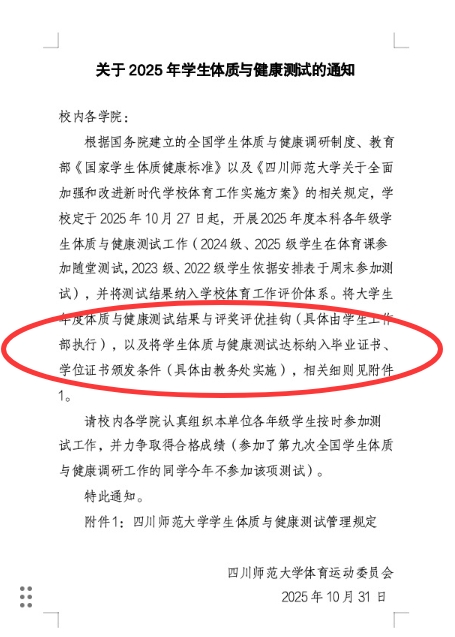 四川师范大学发布《关于2025年学生体质与健康测试的通知》。 通知文件截图,由受访者提供。