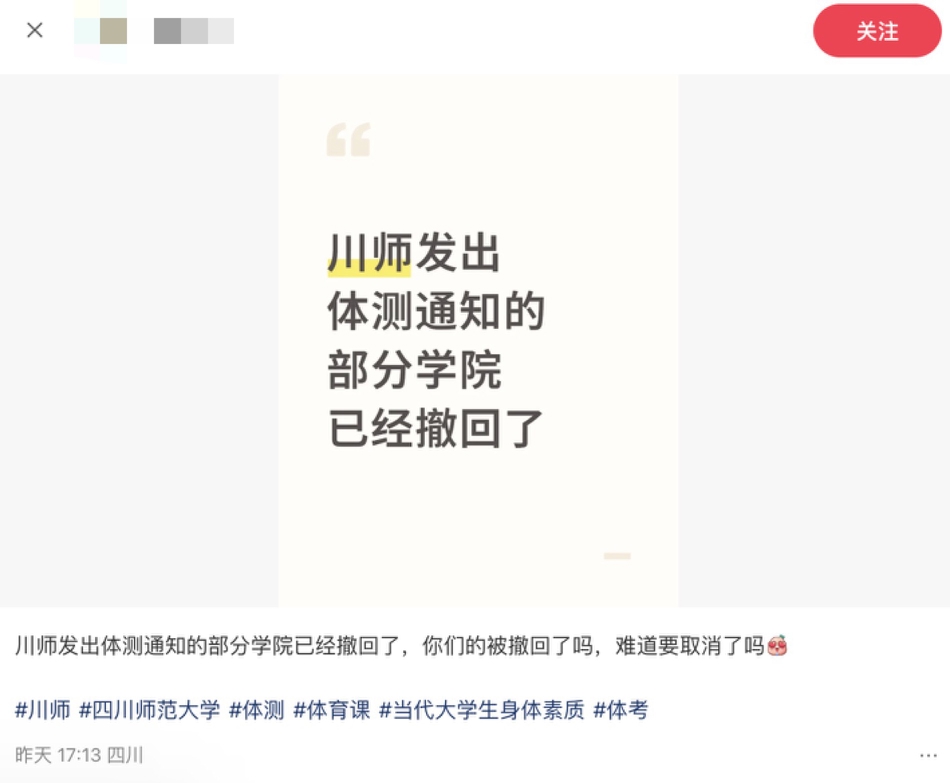 一份落款日期为“10月31日”的体测通知,让四川师范大学不少毕业年级学生陷入焦虑。