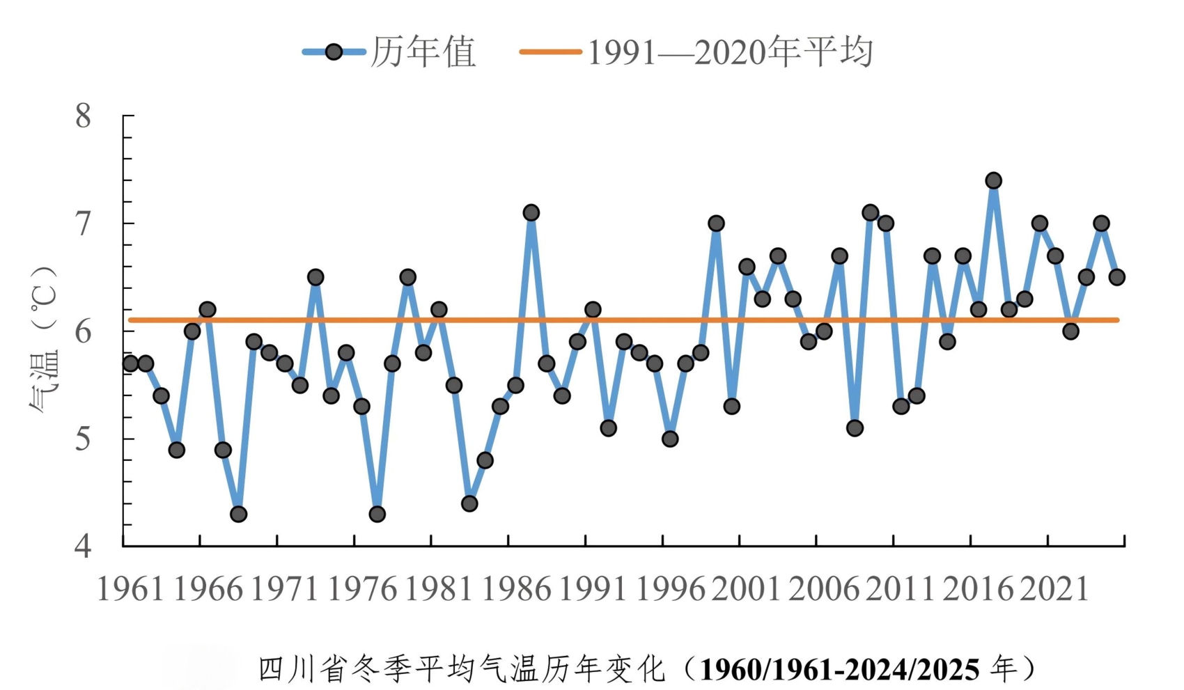 虽然气候在变暖,但四川的冬季并不短。以四川唯一的国家气候观象台——温江国家基准气候站(简称“温江站”)为例。1991年至2020年间,该站常年入冬时间为11月29日,出冬时间为次年3月2日,共95天。2024年,温江站于11月25日正式入冬,于2025年2月26日出冬,共计94天。