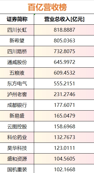 从营收规模来看,川股企业呈现梯队分布。记者统计发现,共有14家川企成功迈入“百亿营收俱乐部”。其中,四川长虹、新希望、四川路桥三家企业表现突出,分别以818.89亿元、805.04亿元、732.81亿元的营收规模稳居川股营收榜前三甲;通威股份、五粮液、东方电气、泸州老窖紧随其后,构成第二梯队;成都银行、新易盛等7家企业则处于100亿-200亿元的营收区间,共同支撑起川股的营收格局。