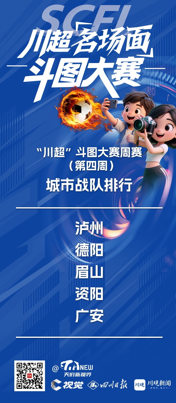 神图齐聚战川超,激情狂欢嗨不停!“川超”名场面斗图大赛(第四周)荣誉榜单如期揭晓。由四川日报·川观新闻、天府新视界发起的“‘川超’名场面斗图大赛”,自10月1日启动后点燃全川创作热潮,第四周周赛投票(10月27日—31日)正式收官,第四周作品排名与城市战队排名出炉,快来感受球迷的热爱与城市的荣光。