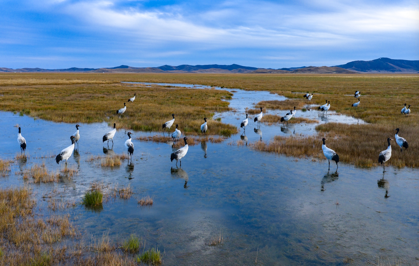 每年秋冬季,候鸟要进行漫长而壮观的南迁越冬之旅,若尔盖是候鸟迁徙途中的重要湿地。近期,若尔盖湿地国家级自然保护区开展监测工作,观测到大批鸟类集群预备南迁的景象。据保护区详细统计,保护区内已记录到黑颈鹤、黑鹳、大天鹅等16种鸟类,数量达3500余只,其中国家一级、二级保护动物5种,分别为黑颈鹤、黑鹳、白尾海雕、白琵鹭、大天鹅。