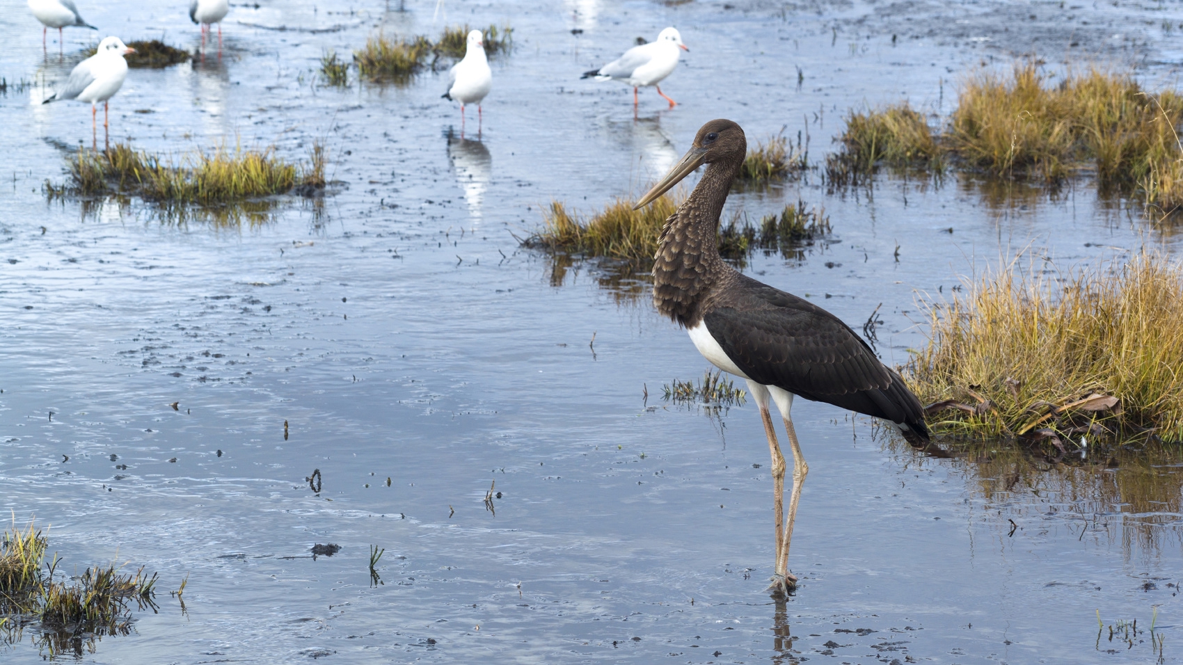 黑鹳和其它鸟类在若尔盖湿地活动。