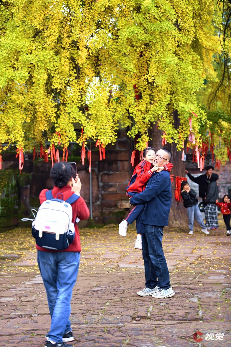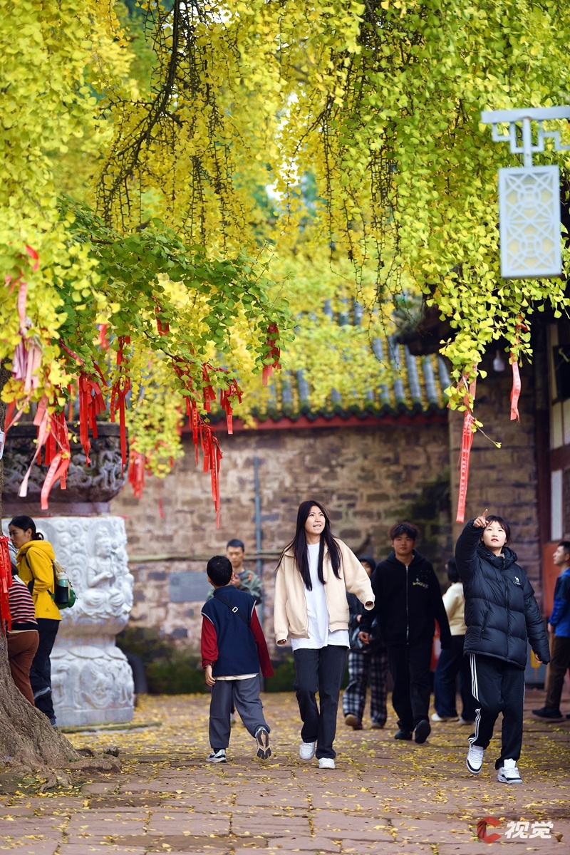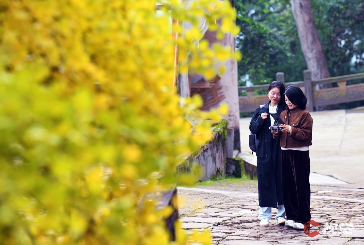 11月2日,游客打卡云顶山慈云寺大门处的银杏树。C视觉签约摄影师 蒋永平 摄