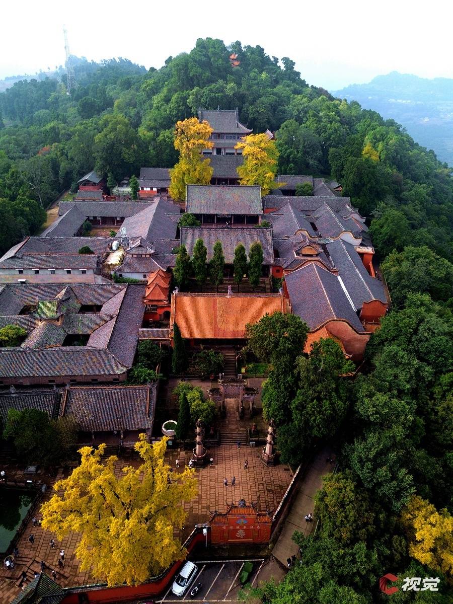 云顶山慈云寺中有两棵屹立千年的银杏树,树围近5米,树高25米,为一雌一雄,被大家称为“夫妻树”,曾获评“天府十大古银杏”称号。每当深秋之季,树上地下满目金黄,诗意与温柔同在。
